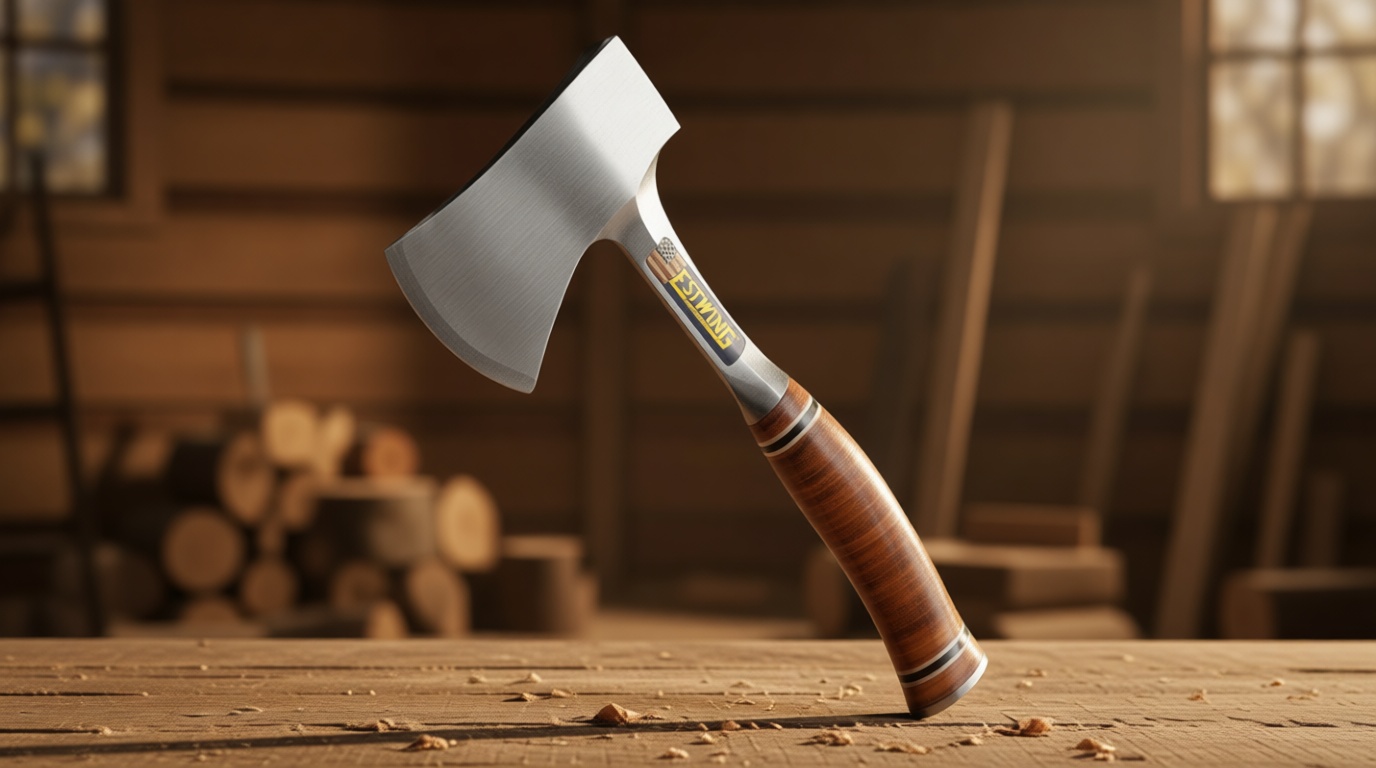 The ESTWING Sportsman’s Axe is a 14-inch USA made camping hatchet with forged steel construction and a genuine leather grip. It is not a full-size splitter, but it has a place for lighter outdoor wood tasks.