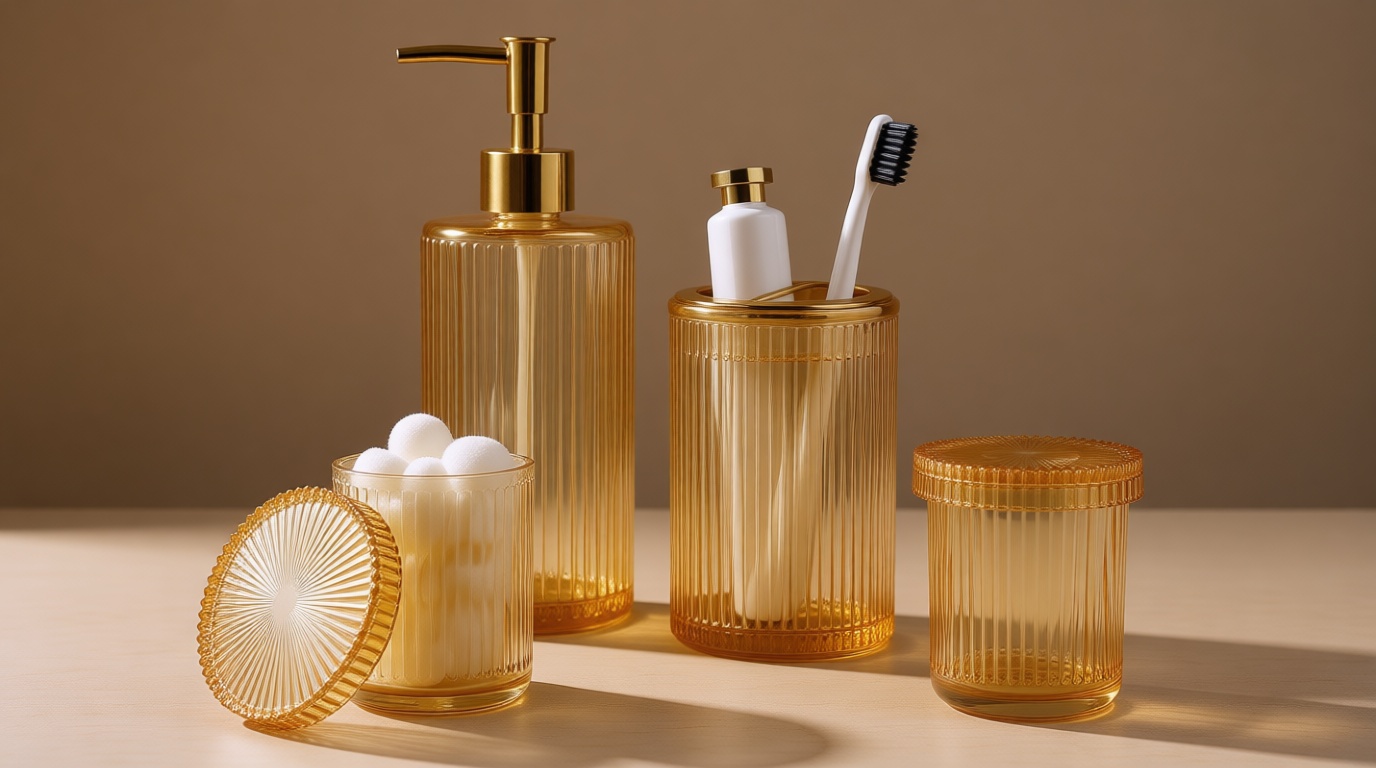 If you want a warmer, more decorative bathroom palette, this gold bathroom accessories set is a strong choice. The glass and gold combination gives the room a more upscale and coordinated appearance.