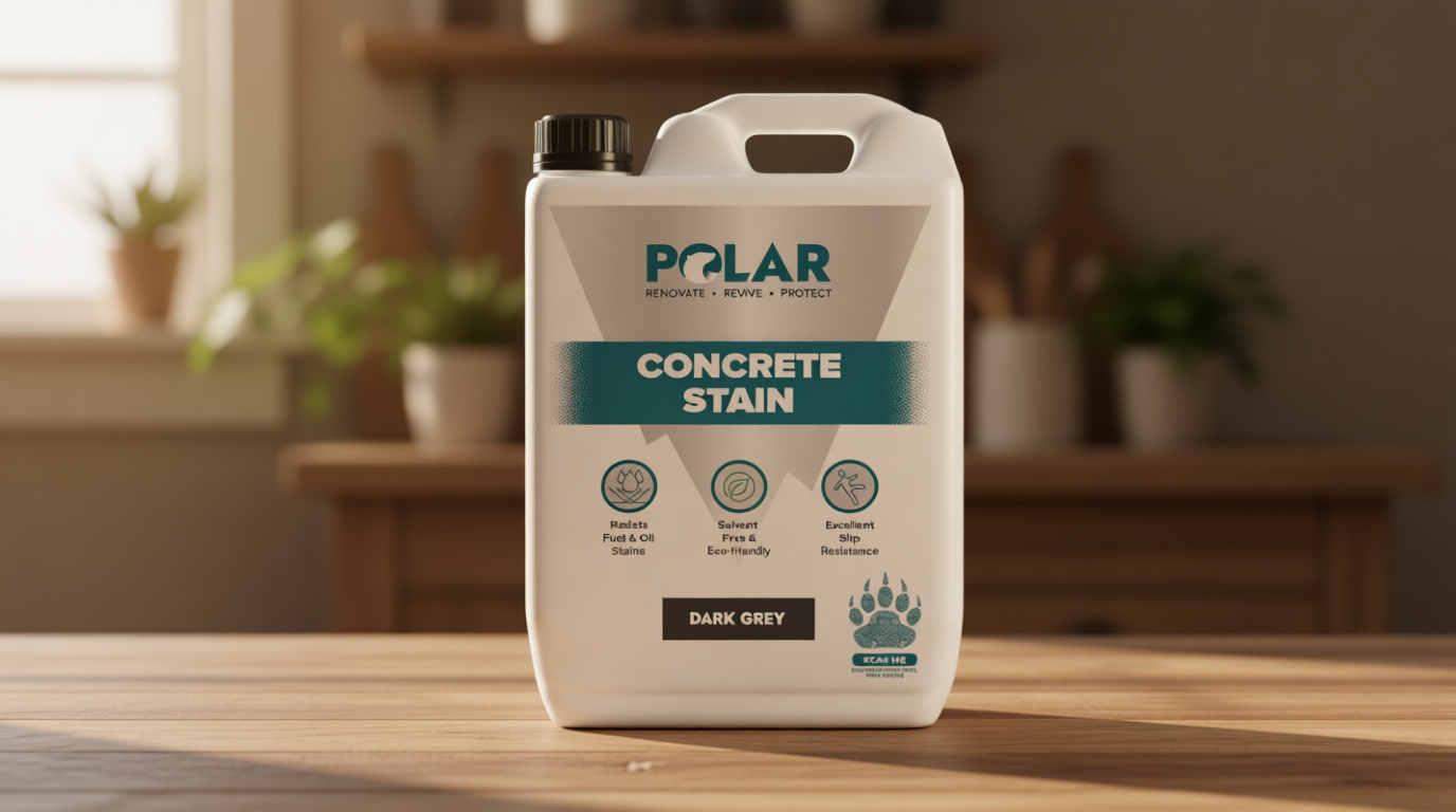 Polar Dark Grey is a 5-litre concrete stain listed as durable with a stain- and slip-resistant finish. It is designed for interior and exterior stone and concrete floors, plus driveways, walkways, and patios.