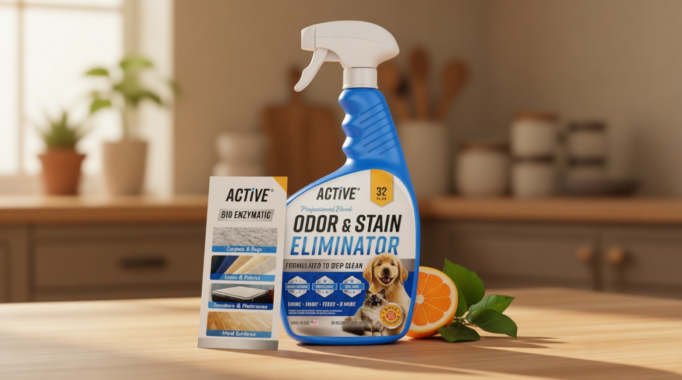 ACTIVE Enzyme Cleaner for Dog & Cat Urine is a 32 oz stain remover spray made for carpet, upholstery, hardwood, and spot cleaning. It is described as a deodorizer with natural citrus oil.