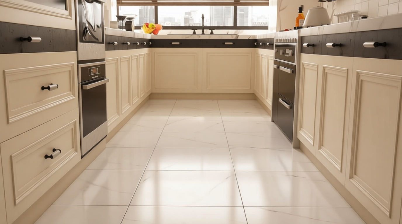 This tile is a practical option for those who prefer a clean and understated finish. The grey veining adds a little depth without making the design feel busy. It is a strong choice if you want flooring that blends in instead of becoming the main focus of the room.