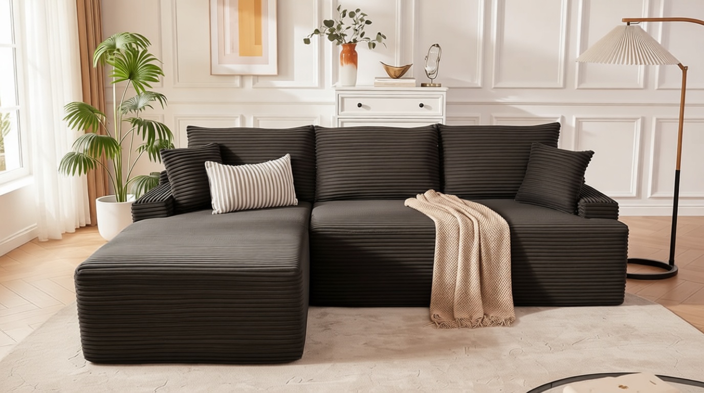 The black corduroy look is bold and modern, while the deep seat and wide armrest details point to a relaxed seating style. It may be a strong fit for buyers who want a casual cloud-sofa feel with less hassle.