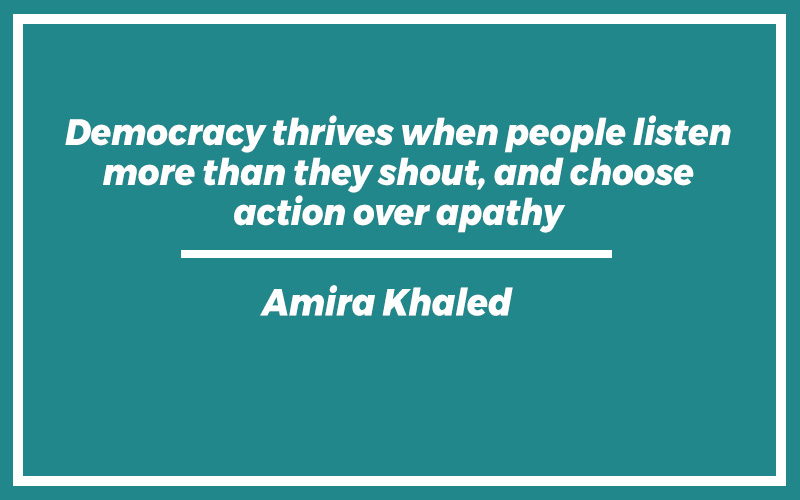 “Democracy thrives when people listen more than they shout, and choose action over apathy.”Amira Khaled