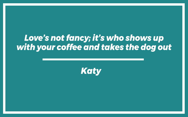 “Love’s not fancy; it’s who shows up with your coffee and takes the dog out.” – Katy