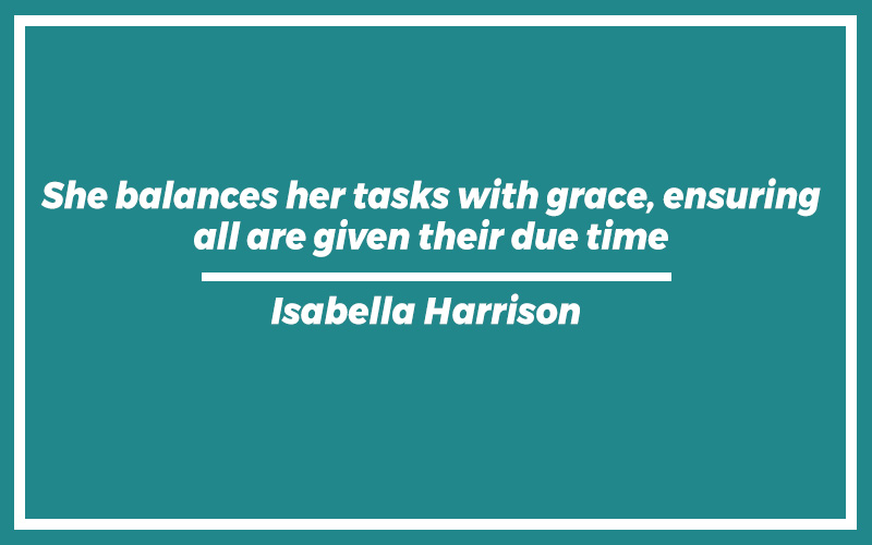 “She balances her tasks with grace, ensuring all are given their due time.”Isabella Harrison
